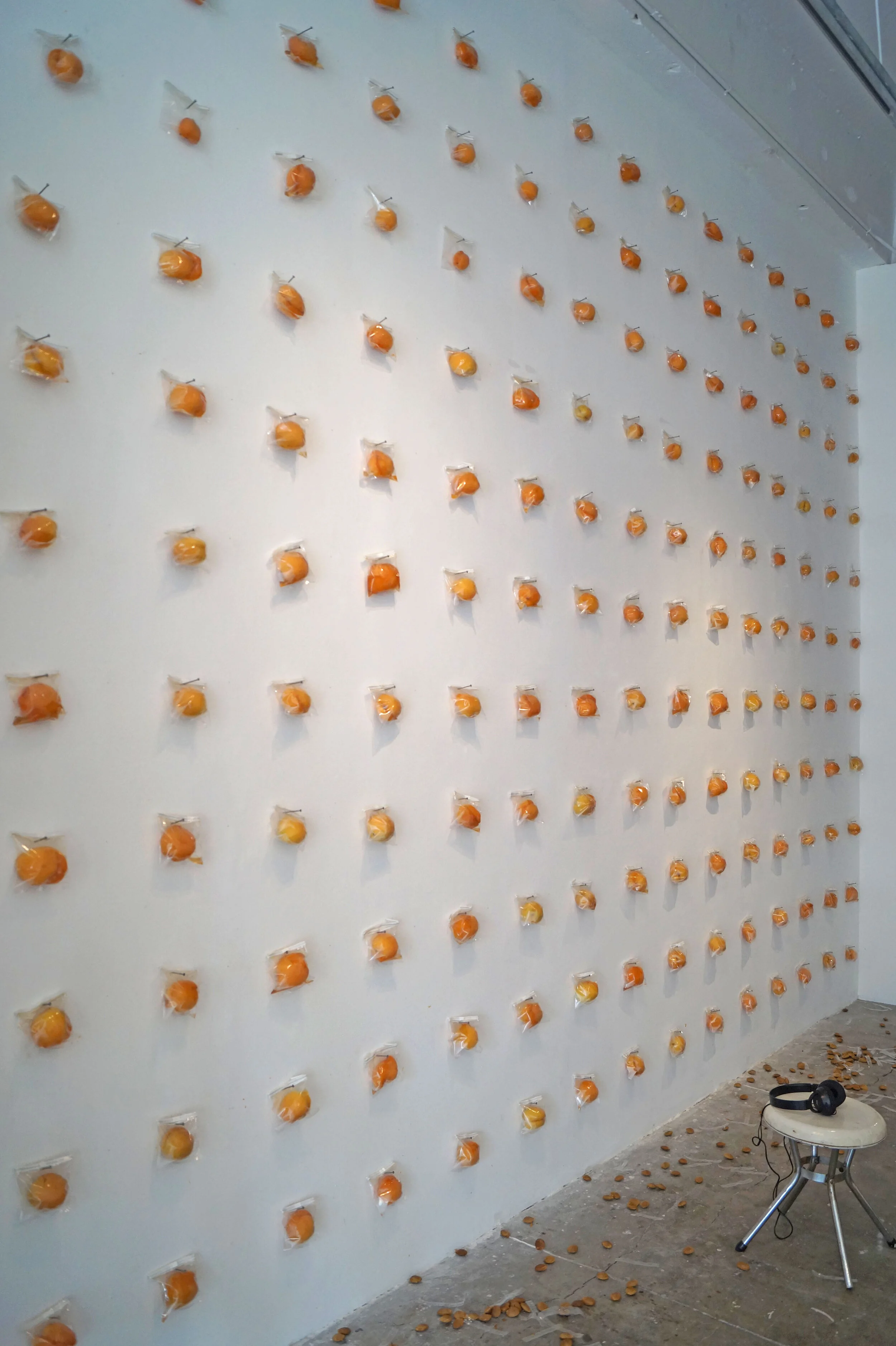 Installation and performance with apricots and specimen bags